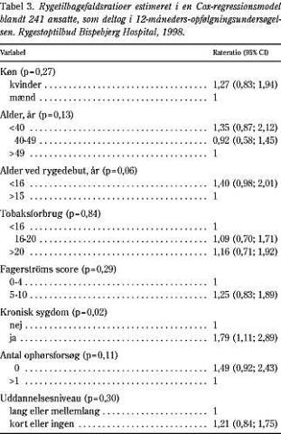 Af Tabel 3 fremgår det, at Fagerströms score ikke i dette materiale har statistisk signifikant betydning for succesraten (p=0,29). I tabellen vises også, at personer med kronisk sygdom har vanskeligere ved at forblive røgfri end personer uden kronisk sygdom (p = 0,02). Materialet omfattede kun fire mænd med kronisk sygdom, disse var alle begyndt at ryge igen efter 100 dage. Blandt kvinderne var der 26 med kronisk sygdom. Materialet var for lille til, at man kunne påvise statistisk signifikante interaktioner mellem variablene.