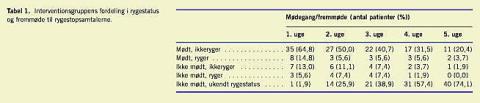 Ved udskrivelsen kendte man ikke rygestatus hos de randomiserede patienter. Ved interventionsgruppens første mødedag, en uge efter udskrivelsen, var 77,8% røgfri. Fremmødet i interventionsgruppen var 80%, svarende til erfaringer i andre projekter [13]. Fremmødefrekvensen og det, at effekten af interventionen ikke var signifikant, rejser spørgsmål om interventionens kvalitet. Projektets interventionsprogram var tilrettelagt efter STOP's anbefalinger. Projektsygeplejerskerne var erfarne rygestopinstruktører med en kardiologisk specialuddannelse. Interventionen foregik ambulant på kardiologisk afsnit, og tidspunktet blev tilrettelagt sammen med patienten, der blev fulgt af samme projektsygeplejerske under hele forløbet. Metoden vurderes optimalt udført.