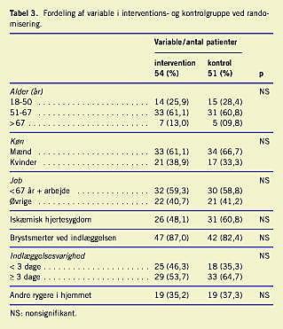 Alle inkluderede patienter angav at være rygere ved indlæggelsen. Rygestatus ved udskrivelsen kendes ikke. Rygestatus og fremmøde i interventionsgruppen blev registreret (Tabel 1 ). Af de 105 patienter havde de fleste en kardiologisk diagnose (Tabel 2 ). De patienter, der droppede ud af projektet, afskilte sig ikke fra de øvrige inkluderede i forhold til alder, køn, IHS, brystsmerter og indlæggelsesvarighed. De patienter, der var motiverede for rygestop, men ikke ønskede at deltage i projektet, afskilte sig ikke fra de inkluderede patienter i forhold til alder, køn, IHS, brystsmerter og indlæggelsesvarighed. De fleste angav at kunne håndtere et rygestop. Ingen reagerede negativt på spørgsmål angående rygevaner, men ønskede ikke at komme på sygehuset, hvis det ikke var nødvendigt. Der var ikke signifikant forskel på fordelingen af variable i interventions- og kontrolgruppen (Tabel 3 ).