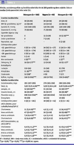 De tre grupper adskilte sig ikke mht. alder, body mass index (BMI), blodtryk, paritet og gestationsalder (GA). Ikkerygerne og eksrygerne var oftere samboende og havde en længere skolegang end rygerne. Der var flere studerende blandt ikkerygerne end blandt rygerne og flere arbejdsløse blandt rygerne end blandt de to andre grupper. Rygerne havde et hø-jere kaffeindtag end ikkerygerne og eksrygerne (Ta-bel 1).