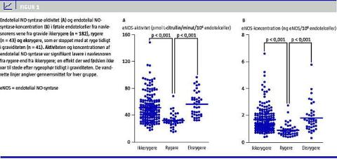 Efter rygeophør tog det ~ 6 år at øge den endotel-afhængige kardilatation med ~ 50% i raske unge voksne [2]. Det tyder på, at EC i eksrygere kun meget langsomt genopretter en NO-dannelse svarende til den i ikkerygerne. I nærværende undersøgelse sammenlignede vi eNOS i EC fra navlesnorens og placentas blodkar med den nyfødtes størrelse fra ikke-rygende og rygende gravide samt fra kvinder, som stoppede med at ryge tidligt i graviditeten.