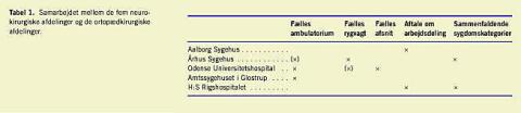 Der er store forskelle mellem organisationen af rygkirurgien på de fem neurokirurgiske afdelinger i Danmark (Tabel 1). På Århus Sygehus har man gennem mere end ti år haft en fælles neurokirurgisk/ortopædkirurgisk rygvagt. På Odense Universitetshospital er der i efteråret 2004 etableret et fælles neurokirurgisk/ortopædkirugisk-rygkirurgisk afsnit, og man er ved at opbygge en fælles rygkirurgisk vagtordning. På H:S Rigshopitalet, Amtssygehuset i Glostrup og Aalborg Sygehus er der ikke etableret rygkirurgiske beredskaber.