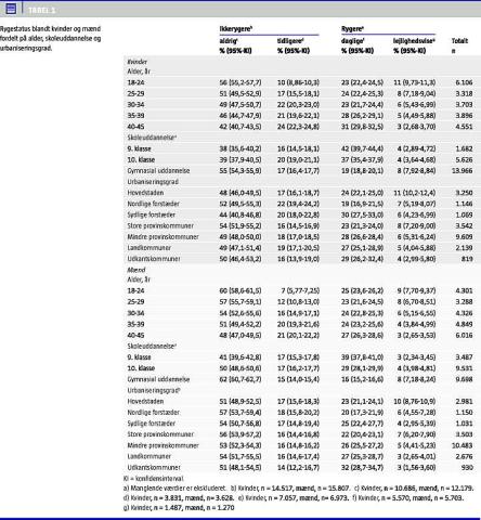 Resultater: Cirka en tredjedel rapporterede, at de var rygere. Flertallet af dagligrygerne havde et forbrug på ≥ 15 cigaretter/dag (59% kvinder, 74% mænd). Forekomsten af aldrigrygere var højere blandt de yngste. Især blandt kvinder var andelen af dagligrygere lavest i de yngre aldersgrupper. Hos begge køn var prævalensen af dagligrygere højest blandt de lavest uddannede, og blandt kvinder var den højest i hovedstadens sydlige forstæder og blandt mænd i udkantskommuner. I multivariat analyse var associationen med et højt cigaretforbrug stærkest for alder (signifikant færre storrygere blandt de yngste) og skoleuddannelse (signifikant flere storrygere blandt de lavest uddannede), hvorimod urbaniseringsgrad havde mindre betydning. Alderen for rygestart synes at være faldende, idet den er lavest i de yngste fødselskohorter og blandt de lavest uddannede.