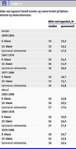 Tabel 2 viser alder ved rygestart fordelt på fødselskohorter for tre forskellige niveauer af skoleuddannelse. Alder ved rygestart faldt fra den ældste fødselskohorte til den yngste både blandt kvinder og mænd og i alle niveauer af skoleuddannelse. Det største fald blev observeret blandt kvinder med en gymnasial uddannelse. Således var gennemsnitsalderen for rygestart i den ældste kvindelige fødselskohorte (1959-1966) med en gymnasial uddannelse 17,3 år, mens den tilsvarende gennemsnitsalder blandt de yngste kvinder (født 1977-1986) var 15,8 år. Den laveste gennemsnitsalder ved rygestart blev observeret blandt kvinder og mænd med 9. klasse i de yngste fødselskohorter (14,7 år). Endelig ses det, at alder ved rygestart var lavere for kvinder end for mænd i alle fødselskohorter.
