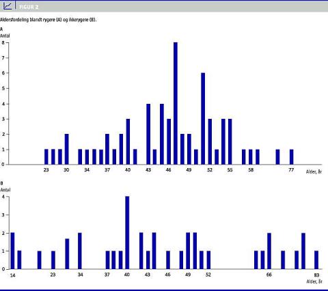 Ud af de 129 evaluerbare patienter var der journaloplysninger om rygning hos 100 patienter (78%). Heraf var 64 rygere, og af disse var 77% storrygere. Alle fire mænd var storrygere. Medianalderen for rygerne var 46 år, og 80% lå i aldersintervallet 35-55 år. For ikkerygerne var medianalderen 43 år, og 56% var 35-55 år (Figur 2 ).