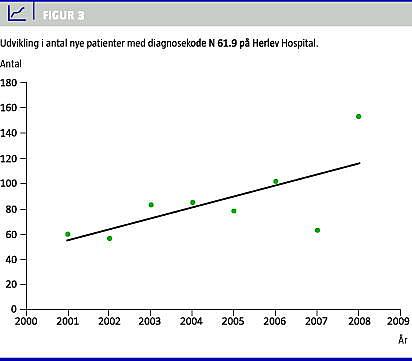 Udvikling i antal nye pat ienter med diagnosekoden N 61.9 på Herlev Hospital i perioden 2000-2008 viser en incidensstigning på gennemsnitligt 14% om året (Figur 3 ). Incidensen for 2008 er korrigeret for, at optageområdet pr. 1.4.2008 blev større ved sammenlægningen af mammacentrene i Herlev og Hørsholm.
