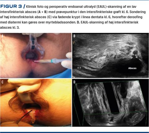 De intersfinkteriske abscesser rapporteres at udgøre alt fra 6% til over 20%. De er lokaliseret imellem lukkemusklerne [4, 15, 16] og kan inddeles i hhv. høje (lokaliseret oralt for linea dentata) og lave (lokaliseret analt herfor) (Figur 2A og Figur 3). Patienterne har udtalte analsmerter, oftest forhøjede infektionstal og eventuelt defækationsblokade og urinretention. De lave abscesser kan bidigitalt palperes som en udfyldning i relation til den intersfinkteriske grøft. Dette er smertefuldt og kan typisk kun udføres under anæstesi. De høje abscesser kan som oftest ikke ses eller palperes, og peroperativ endoanal ultralyd (EAUL)-skanning er en uovertruffen hjælp. (Figur 3B og D) Den initialt høje intersfinkteriske absces kan descendere og ende med at fylde hele det intersfinkteriske rum [17].