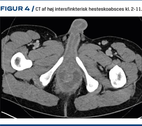 CT med intravenøs kontrast kan typisk udføres døgnet rundt. Hvis der er mistanke om en supralevator absces, høj intersfinkterisk absces eller hesteskoabsces som baggrund for sepsis, kan en CT give afklaring i vagten [21] (Figur 4).