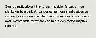 Hvad er det slankebøgerne kan? De syv kostråd krydret med 30 minutters motion om dagen bliver man i hvert fald ikke rig af at skrive om. Næh, når man læser de mange slankebøger, der kæmper om toppen på salgslisten, bliver det klart, at der findes en logisk skabelon for, hvordan en slankebestseller skal skrues sammen med heraf følgende indtjening [1].