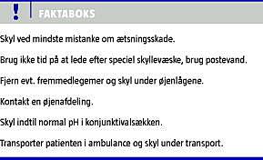 Som tidligere anført er hurtig behandling af stor betydning for udfaldet af kemiske øjenskader. Behandling skal iværksættes, blot på mistanke. Primært er postevand et godt skyllemiddel, og vigtigst er skylning med rigelige mængder neutral væske. Opløsninger med en osmolalitet svarende til tårefilmens er påvist at være gode skyllemidler [8]. Isotonisk fosfatbuffer har tidligere været brugt til øjenskylning, men det har vist sig ikke at være særlig effektiv og kan give kalcifikationer på cornea [9]. Derimod er blandt andet Cederroth Eye Wash Solution en effektiv buffer [7]. Dette har politiet på Vesterbro med sig i bilerne.