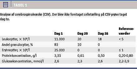 På klinisk mistanke om sepsis blev der påbegyndt behandling med cefuroxim og gentamicin. I løbet af få timer blev barnet tiltagende irritabelt og takypnøisk med grålig hudfarve. Der blev foretaget lumbalpunktur og celletælling, og resultatet tydede på meningitis (Tabel 1).