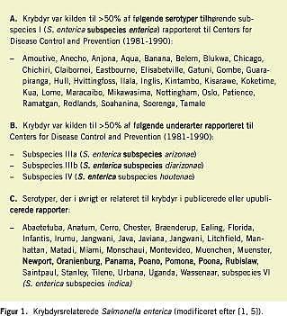 For det andet illustrerer kasuistikken, at krybdyr også i Danmark er en kilde til Salmonella- infektioner. Især ved infektioner med »eksotiske« Salmonella- serotyper, dvs. serotyper, der ikke er S. Enteritidis eller S. Typhimurium, hos børn, er det relevant at medtænke krybdyr som smittekilde. Ud over patienten i denne kasuistik har vi kendskab til en fem måneder gammel pige, som fik gastroenteritis på grund af S. enterica subspecies diarizonae- infektion sandsynligvis erhvervet fra familiens slanger. Salmonella af subspecies diarizonae er særdeles hyppige blandt slanger. Figur 1 viser serotyper, som i særdeleshed er relateret til smitte fra krybdyr som slanger, skildpadder, leguaner, kamæleoner og andre »firben«.