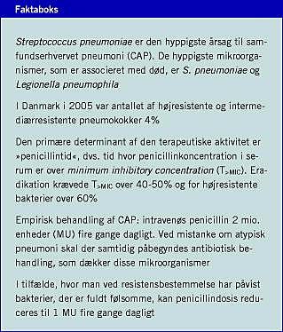 Behandling af samfundserhvervet pneumoni (CAP) med penicillin er præget af manglende konsensus, hvad angår dosis, hyppighed og formulering. En af årsagerne til den manglende konsensus er internationale forskelle i resistensudvikling. Antibiotikaresistensen har udviklet sig fra under 0,02% i 1987, 3% i 1994 til over 15% i 1996 i nogle dele af USA. I et studie fra USA, omfattende Streptococcus pneumoniae fra 1.527 patienter med pneumoni, var 14,1% af de isolerede bakterier interme-diærresistente (minimum inhibitory concentration (MIC) 0,1-1,0 mikrogram/ml) og 9,5% højresistente (MIC > 2,0 mikrogram/ ml). I Holland er penicillinresistensen hos pneumokokker steget fra 0,7% i 1994 til 1,5% 1999. Der er også registreret en mindre stigning i makrolidresistens. Statens Serum Institut, Fødevarestyrelsen, Lægemiddelstyrelsen og Danmarks Fødevareforskning overvåger antibiotikaresistens i Danmark. De har observeret en stigning af penicillinresistente pneumokokker (MIC > 0,06 mikrogram/ml) fra 0,8% til 3,8% i perioden 1990-1999, mens andelen af højresistente pneumokokker (MIC > 2,0 mikrogram/ml) har været konstant på 0,4-0,8% siden 1995. I 2005 var antallet af højresistente og intermediærresistente pneumokokker 4%. Danmark er formentlig blandt de lande, der har lavest forekomst af penicillinresistens.
