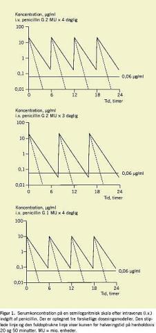Ved indlæggelse påbegyndes intravenøs behandling med penicillin 2 MU fire gange dagligt. Dermed opnås en penicillinkoncentration (C) over 0,06 mikrogram/ml det meste af døgnet hos alle patienter. Ydermere kan der hos nogle patienter opnås en samtidig penicillinkoncentration over 1,0 mikrogram/ml i ca. 40% af døgnet (Figur 1). MIC for intermediær-resistente stammer er 0,1-1,0 mikrogram/ml. På den måde sikres en effektiv behandling, ikke kun over for de penicillinfølsomme mikroorganismer, men også over for de intermediærresistente mikroorganismer i de første døgn inden et resistenssvar foreligger.