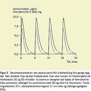 Eagle et al [3, 4] har i dyremodeller påvist, at den primære determinant af den terapeutiske aktivitet er »penicillintid«, dvs. tid hvor penicillinkoncentrationen i serum er over MIC (T>MIC). Ydermere har man i andre studier fundet, at T>MIC er en vigtig faktor for eradikation [5]. Eradikation er vigtigt for at undgå selektion af de resistente stammer, hvilket kan fremkaldes ved en insufficient behandling [6]. Koncentration af penicillin i serum og eksponeringstiden påvirker endvidere den tid, bakterier behøver for at genvinde deres toksicitet [3].