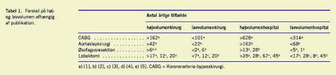 Der er heller ingen klar definition af, hvad høj- eller lav-volumen er med hensyn til antal indgreb pr. kirurg eller antal operationer udført på en given afdeling. Tabel 1 giver en oversigt over, hvad man kommer frem til, hvis man skeler til de øverste og nederste kvartiler i de store registre. Desuden illustrerer tabellen, at der er betydelige forskelle mellem de forskellige operationstyper.