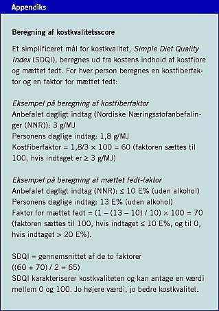 Gennemsnittet af de to faktorer betegnes SDQI. SDQI karakteriserer kostkvaliteten og kan antage en værdi mellem 0 og 100 [13]. Jo højere værdi, des bedre kostkvalitet, dvs. højere indtag af frugt og grønt, fisk, grove cerealier og fedtfattige kød- og mejeriprodukter, samt lavere indtag af fedtstoffer, slik, sukkersødede drikkevarer og alkohol. Gruppen, der havde en kost, som tilnærmelsesvis levede op til NNA og Kostrådene 2005, havde et gennemsnitligt SDQI på 87.