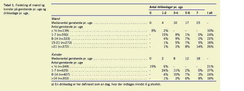 Af Tabel 1 fremgår, at 26% af mændene og 18% af kvinderne drak mere end SSTs maksimale genstandsgrænser i løbet af ugen. Det sås også, at jo flere ugentlige drikkedage, jo højere alkoholforbrug. En drikkedag er her defineret som en dag, hvor der indtages mindst en halv genstand (6 g alkohol). Det sås endvidere, at kun 8% af mændene og 15% af kvinderne slet ikke drak alkohol i løbet af registreringsperioden.