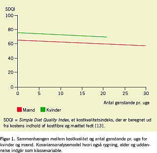 Resultater: Både med stigende antal genstande pr. uge og med stigende antal ugentlige drikkedage, sås en dårligere kostkvalitet. I begge tilfælde var tendensen mere tydelig for mænd end for kvinder. Gruppen af mænd og kvinder med bedst kostkvalitet havde et gennemsnitligt alkoholforbrug i overensstemmelse med NNAs øvre alkoholgrænser samt færre ugentlige drikkedage end grupper med dårligere kostkvalitet.
