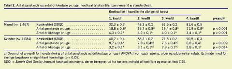 Tabel 2 viser, at mænd og kvinder i den bedste kostkvalitetskvartil i gennemsnit drak henholdsvis 12 og syv genstande pr. uge, dvs. i overensstemmelse med NNA's øvre alkoholgrænse, mens mænd og kvinder i kvartilerne med dårligere kostkvalitet gennemsnitligt drak mere end NNAs øvre alkoholgrænse, men mindre end SSTs genstandsgrænser. Ydermere havde mænd og kvinder i den bedste kostkvalitetskvartil i gennemsnit færre drikkedage pr. uge end mænd og kvinder med dårligere kostkvalitet.