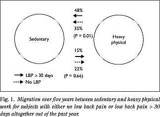 Diskussion: Stillesiddende arbejde er ikke en risikofaktor for at udvikle LRS, hvorimod tungt fysisk arbejde udgør en betydelig risiko. På grund af vandring mellem belastningsgrupperne (healthy worker effect) er longitudinale undersøgelser påkrævede, når forholdet mellem fysisk arbejdsbelastning og LRS undersøges.