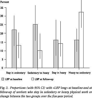 Resultater: Ved undersøgelsens start fandtes ingen statistisk signifikant forskel vedrørende LRS mellem personer i de forskellige belastningsgrupper. Dette gjaldt for begge køn og alle alders- og socialgrupper. Ved femårsopfølgningen fandtes et statistisk signifikant dosis-respons-forhold mellem alle LRS og længerevarende LRS inden for det seneste år og stigende fysisk arbejdsbelastning ved undersøgelsens start. Personer med tungt fysisk arbejde ved undersøgelsens start skiftede signifikant oftere til stillesiddende arbejde, hvis de havde haft LRS mere and 30 dage inden for det seneste år.