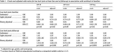 Ved undersøgelsens start fandtes ingen statistisk signifikante forskelle mellem de tre belastnings-kategorier i relation til alle tre LRS-definitioner (Tabel 1). Dette var gældende for begge køn og i alle alders- og socialgrupper. Ved femårsopfølgning fandtes et statistisk signifikant dosis-respons-forhold mellem stigende fysisk arbejdsbelastning ved undersøgelsens start og LRS overhovedet og langvarige LRS (Tabel 1). Således udgjorde stillesiddende arbejde en beskyttende eller neutral effekt, mens tungt fysisk arbejde var en signifikant risikofaktor.