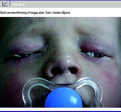 Ved ankomst var patienten grædende, men ikke forpint. Objektivt fandtes sammenklistrede øjenlåg men frit bevægelige bulbi (Figur 1 ). Der afventedes i 24 timer, men da der ikke var mindste tegn på bedring, gennemføres kirurgi i generel anæstesi. Under indgrebet overklippedes cilier, og limrester blev fjernet. Bulbi fandtes upåvirkede med klare corneae uden abrasio. Efter operationen behandledes med chloramphenicolsalve × 4 i begge øjne. Ved efterfølgende kontrol en uge efter var drengen i habitualtilstand, og der fandtes normalt visus og i øvrigt normal øjenundersøgelse.