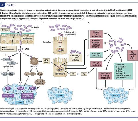 I det dysbiotiske mikrobiota falder produktionen af epitelcellernes vigtigste energikilde – de kortkædede fedtsyrer – hvilket bl.a. medfører stigende intraluminale pH-værdier og reduceret suppression af proinflammatoriske cytokiner, bl.a. interleukiner og tumornekrosefaktor alfa. Med akkumulerede, sporadiske eller nedarvede mutationer og epigenetiske ændringer udvikles der et kritisk miljø, som er afgørende for udvikling af kolorektal cancer (Figur 1) [4, 5].