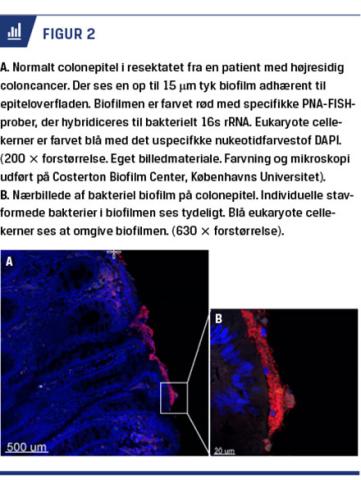 I adenomvæv, cancervæv og normalt colonepitel tæt ved tumoren kan der ofte påvises biofilm i tæt relation til underliggende epitelceller (Figur 2), i hvilke der bl.a. kan påvises reduceret niveau af E-cadheriner, øget forekomst af interleukin-6, øget intestinal permeabilitet og signal transducer and activator of transcription 3-aktivering [17].