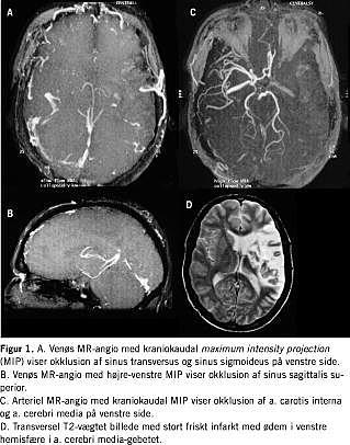 Kort tid efter forværredes tilstanden, og ny MR-skanning af cerebrum viste total sinus sagitalis superior-trombose, trombose af sinus transversus og sinus sigmoideus på venstre side (Figur 1). Trods antikoagulansbehandling blev patienten tiltagende bevidsthedssvækket, og mors indtrådte få dage senere.