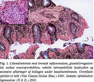 Det subepiteliale kollagenbånd var stærkt fortykket (Fig. 1). Der var moderat interstitiel fibrose og moderat atrofisk colonslimhinde med diskret kirteludfald samt moderat inflammation med lymfocytter og plasmaceller i lamina propria som ved kollagen colitis. Der var enkelte intraepiteliale lymfocytter, men langtfra i et antal som ved lymfocytær colitis. Desuden sås flere biopsier med mere akut inflammation i form af neutrofile granulocytter i lamina propria, fokal granulocytinfiltration i kryptepitelet, enkelte små kryptabscesser, et enkelt epiteloidcellegranulom uden nekrose og snoede, spaltede krypter. De inflammatoriske forandringer fortsatte ned i submucosa, hvor der var moderat kronisk betændelse. Således forandringer der var forenelige med mb. Crohn.