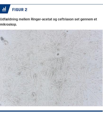 Et eksempel, hvor uforligelighed kan erkendes ved bundfald, er reaktionen mellem ceftriaxon og calciumholdige væsker. Der er beskrevet udfældning i infusionsslanger samt hvide krystaller i organer efter infusion [5, 10, 11] pga. dannelse af et uopløseligt calcium-ceftriaxon-kompleks [9]. Derfor må ceftriaxon ikke gives sammen med calciumholdige lægemidler som Ringer-laktat eller -acetat.