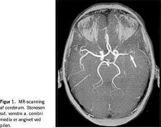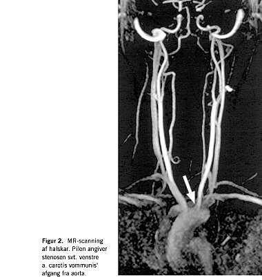 En 42-årig, tidligere rask kvinde af dansk afstamning blev indlagt på mistanke om apopleksi. Forud for indlæggelsen havde patienten haft hovedpine og tilbagevendende tilfælde af 1-2 minutters varighed med følelsesløshed og tyngdefornemmelse i de højresidige ekstremiteter, efterfulgt af nedsat kraft og styringsbesvær. Der var ingen familiære dispositioner for tromboemboliske sygdomme. Tobaksforbruget var på 10-15 cigaretter daglig. Hun anvendte ikke hormonel antikonception. Objektivt fandtes højresidig central facialis parese samt nedsat kraft i højre underekstremitet. Der påvistes leukocytose, uden C-reaktivt protein eller sænkningsreaktionsforhøjelse. En magnetisk resonans (MR)-skanning af cerebrum, et elektroencefalogram og en spinalvæskeundersøgelse viste alle normale forhold, og efter 12 dages indlæggelse blev patienten udskrevet. Hun blev genindlagt fem uger senere med ekspressiv afasi og kramper i begge underekstremiteter. En computertomografi af cerebrum viste infarkt ved venstre capsula interna. En ultralydundersøgelse af halskar og hjerte viste, at de var uden embolikilder. På mistanke om postinfarkt epilepsi blev patienten sat i behandling med oxcarbazepin. I efterforløbet fik hun urtikaria og Coombs negative hæmolyse (medikamentelt betinget?). oxcarbazepin blev erstattet med clonazepam, og der indledtes højdosis prednisolonbehandling. Objektivt fandtes nu mislyd under begge claviculae. Blodtrykket var normalt (120/70) på begge arme. På mistanke om TA blev der foretaget MR-angioskanning af cerebrum og halskar, hvorved der påvistes stenose på hhv. venstre a. cerebri media (Figur 1 ) og venstre a. carotis communis ved afgangen fra aorta (Figur 2 ). Ved trombofiliudredning fandtes patienten homozygot for FVL, hvorfor antikoagulantiabehandling blev iværksat. Patienten blev overflyttet til reumatologisk afdeling, hvor der efterfølgende fandtes forskelle i blodtrykket (højre: 139/84, venstre: 118/75). Efter yderligere tre ugers steroidbehandling hørtes mislydene ikke længere.