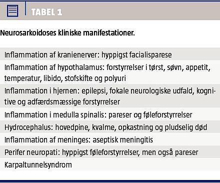 Sarkoidose er en granulomatøs multisystemsygdom. Hyppigst er lunger, hud og øjne involveret. Der er ca. 400 nye tilfælde om året i Danmark. 5% af sarkoidosepatienterne har eller får neurologiske komplikationer i forbindelse med deres sygdom [1]. Sygdommen kan afficere alle dele af nervesystemet [1-3] (Tabel 1). De neurologiske symptomer behandles ved at behandle grundsygdommen. Kortikosteroider er primærbehandlingen evt. suppleret med immunsuppressiver.