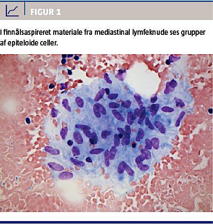 Biopsier fra de mediastinale lymfeknuder viste granulomatøs inflammation med epiteloide celler (Figur 1) uden nekrose, hvilket er foreneligt med sarkoidose.Patienten blev behandlet med prednisolon, 100 mg kortikosteroid fire gange dagligt under diagnosen neurosarkoidose, og man overgik senere til methotrexat. Hun fik det bedre respiratorisk, og der var langsom bedring af svælgparesen og tetraplegien. Hun blev udskrevet til neurorehabilitering. Infiltraterne forsvandt under prednisolonbehandlingen, for at komme igen i den terminale fase, hvor en røntgenoptagelse af thorax bekræftede sarkoidose.