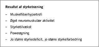Det samme gælder for muskelstyrken, som øges med 10-45%. Træningsresponset synes at være større hos skrøbelige ældre med stort styrkedeficit [7] end hos raske, fysisk aktive ældre [26, 27]. Endvidere peger man i den eksisterende litteratur på, at power øges ved styrketræning, især ved højhastighedstræning. Således kan årtiers styrketab reverseres, hvilket potentielt udsætter tidspunktet for nedsat funktionsevne - et potent argument for styrketræning som modtræk til sarkopeni.