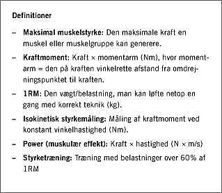 Det vides, at styrketræning kan øge muskelmassen og -styrken signifikant hos ældre [4-6] og selv hos meget gamle [7-9]. Endvidere kan styrketræning forbedre ældres funktionsevne [7]. Styrketræning synes således at være højst anvendelig.