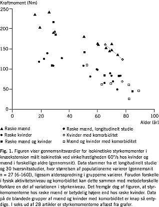 Muskelstyrken falder med gennemsnitligt 1-1,5% om året efter 60-65-års-alderen [17, 18], og kan hos ældre først i 70'erne være 50% lavere end hos unge [19]. Den muskulære effektudviklingsevne (power) reduceres i endnu større grad med gennemsnitligt 3,5% om året fra 65-års-alderen [18], og kan hos ældre først i 70'erne være 70% lavere end hos unge [19] (Fig. 1 ).