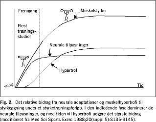 Der synes ikke at eksistere nogen sammenhæng mellem overordnet styrketilvækst og hypertrofi på helmuskel- eller enkeltfiberniveau, hverken efter typisk tre måneders [1] eller et års træning [4]. Samlet harmonerer ovenstående med, at man i mange studier kun kan forklare 10-15% af styrkeøgningen ved øget muskelmasse [28]. Da de fleste af disse studier har varet 8-12 uger, bør man tage højde for den typiske tidshorisont for bidraget til styrkeøgning fra henholdsvis neurale faktorer, f.eks. øget neuromuskulær aktivitet [6, 31], og muskelhypertrofi [29] (Fig. 2).
