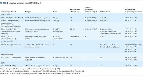 Efter epidemierne med SARS-CoV og Middle East Respiratory CoV har bl.a. de amerikanske sundhedsmyndigheder udviklet forskningsprogrammer, som er målrettet udviklingen af vacciner mod coronavirus og andre virus med pandemisk potentiale [2-4]. Udviklingsarbejdet muliggjorde en hurtig respons i januar 2020, og i februar 2021 er mere end 200 studier af vacciner registreret, og 78 undersøges i kliniske studier, hvoraf 20 er nået til fase III-studier (Tabel 1) [5, 6]. I denne artikel præsenteres vacciner, som enten er eller forventes godkendt i EU (mRNA, vektorbaserede og proteinbaserede) eller som er udbredt uden for EU (inaktiveret virus).