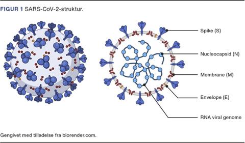 SARS-CoV-2 indeholder et RNA-genom med 12 proteinkodende open reading frames. De vigtigste fire strukturelle proteiner er spike (S), envelope (E), nucleocapsid (N) og membran (M). S, E og M udgør viruskappen, mens N indeholder RNA-genomet (Figur 1) [1]. Spike er det dominerende overfladeprotein og det primære mål for neutraliserende antistoffer.
