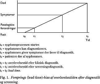 Denne vurdering er desværre ikke helt simpel. Det er fx ikke nok blot at konstatere, at de personer, der blev diagnosticeret efter screeningen, lever længere end andre patienter, efter at sygdommen er diagnosticeret. Screening vil sædvanligvis flytte diagnosetidspunktet frem i tid - det er faktisk hele formålet - og det vil give længere overlevelsestid, også selv om dødsalderen forbliver den samme. Dette kaldes lead time bias eller forspringsbias og betyder blot, at tiden som patient bliver længere for de personer, der ikke får gavn af den screeningsinducerede behandling. Dette er illustreret i Fig. 1 , hvor livsbanen for en person er indtegnet. Sygdommen starter ved t0 og kan diagnosticeres ved t1 ved anvendelse af en screeningstest. Sygommen vil under alle omstændigheder blive diagnosticeret ved t2, og personen dør ved t3. Figuren illustrerer den maksimale lead time bias for en person, hvis sygdomsforløb ikke påvirkes af behandlingen. Levetider efter diagnostik er effektmål, der må tolkes med betydelig forsigtighed, når et screeningsprogram skal vurderes.