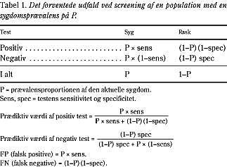 Til disse to problemer skal føjes, at der er forskel på betingede sandsynligheder og en manglende forståelse af det koster penge og liv. Sandsynligheden for at være syg, hvis en screeningstest er positiv, er ikke lig med sandsynligheden for at være testpositiv, hvis man er syg. Hvis 80% af alle syge »fanges« af en screeningstest, betyder det ikke nødvendigvis, at der er 80% risiko for at være syg, hvis man testes positiv. Ofte vil det være meget mindre. Den prædiktive værdi af en positiv test er heller ikke den samme i klinikken som ved en befolkningsscreening. Klinikeren kan let komme ud for, at den prædiktive værdi af en positiv test går fra meget høje til meget lave værdier, når testen skifter fra at blive anvendt på selektive hospitalspatienter til udtræk fra befolkningen. Tabel 1 angiver den forventede fordeling imellem raske og syge, testpositive og testnegative som en funktion af testens sensitivitet (sens, andelen af syge, der forventes at blive testet positive), specificitet (spec, andelen af raske, der forventes at blive testet negative) og sygdommens prævalens (P). Da P typisk er lav i screeningssituationen (oftest under 10% og undertiden under 1%) vil testens specificitet få afgørende betydning for den prædiktive værdi. Det fremgår af formler for prædiktiv værdi, at hvis man anvender den samme test med en sensitivitet på 80% og en specificitet på 90% i en hospitalssituation, hvor 50% har den pågældende sygdom, så vil 88,9% af de testpositive være syge. Bruges testen på en befolkning med en sygdomsprævalens på 1%, vil 7,5% af de testpositive være syge, sådan som det vises i Tabel 2 .