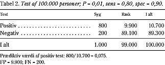 Læger har ofte problemer med denne simple sandsynlighedsregning. Ansatte og studenter på Harvard Medical School fik fx stillet spørgsmålet: »Hvis en test, der er falsk positiv i 5% af tilfældene, bruges til at finde personer med en sygdom, som en ud af 1.000 har, hvad er da sandsynligheden for at en testpositiv person faktisk er syg, givet det er den eneste information du har?« Det hyppigste svar var 95%, og mindre end 20% gav det næsten korrekte svar: 2% (2). Formlen under Tabel 2 viser, at det helt korrekte svar ville være, at det også afhænger af testens sensitivitet (ingen gav dette svar). Svaret forudsætter, at testen fanger alle syge (sensitivitet på 100%), men sensitiviteten spiller næsten ingen rolle, når prævalensen er lav. Det afgørende er risikoen for falsk positive (1-specificiteten), og hvis 2% er godt nok på Harvard, så lader vi det også passere i Århus.