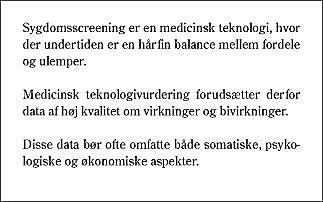 Når dette er sagt, må det også siges, at der er god dokumentation for, at screeningsprogrammer kan være en fornuftig investering. Under alle omstændigheder er screening en teknologi, hvis udvikling ikke lader sig bremse. Ofte står valget mellem systematisk og planlagt screening i forhold til en usystematisk screening og et stigende forbrug af screeningstest.