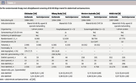 Der er gennemført fire randomiserede studier (Tabel 2) heraf ét i Danmark [8, 11, 19, 20]. I et Cochranereview fandt man, at screening af 65-84-årige fordoblede antallet af forebyggende operationer, halverede antallet af rAAA og nedsatte dødeligheden af AAA med 40% [21]. I det australske studie er analysen begrænset til 65-74-årige, og der er korrigeret for en udtalt forsinkelse mellem randomisering og screeningsundersøgelse på op til to år. Her fandt man i en senere metaanalyse, at screening nedsatte dødeligheden af AAA med 53% og totaldødeligheden med 3% [22]. Det britiske MASS-studium var som det eneste designet til at kunne detektere en forskel i dødelighed med passende styrke, og man har netop også her rapporteret om en signifikant langtidsreduktion i totaldødeligheden på 3% [23].