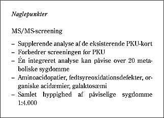 Screening for PKU med MS/MS giver en markant reduktion af falsk positive resultater (8). Dette skyldes dels MS/MS-metodens analytiske præcision, dels det centrale tema ved MS/MS: at man kan anvende multiple analytter til screening. Den enzymatiske fejl i PKU (fenylalaninhydroxylase-mangel) resulterer i ophobning af fenylalanin som følge af defekt konvertering af fenylalanin til tyros in. Markøren ved konventionel screening er derfor fenylalanin. Men da en væsentlig del af blodets indhold af tyrosin stammer fra fenylalanin, er den kompositte markør, fenylalanin:tyrosin-ratio, også anvendelig i diagnostikken. Ud over styrken ved at måle på begge sider af det enzymatiske blok, korrigerer ratio også for volumenimpræcision i blodprøven og for postprandial stigning i blodets aminosyreniveau, da fenylalanin og tyrosin påvirkes i samme retning. Ved den nuværende screeningsmetode i Danmark anvender man en fenylalaninafhængig bakterievækst som screeningsparameter. Dette gør målemetoden uforenelig med antibiotikabehandling, hvilket resulterer i flere hundrede gentagne prøver årligt, forsinket diagnostik og kompliansproblemer. Desuden er det pga. metodens semikvantitative præg nødvendigt at sikre tilstrækkelig ophobning af fenylalanin, hvorfor prøven anbefales taget i 5.-7. levedøgn. Det optimale tidspunkt ved MS/MS-baserede screeningsprogrammer er 48-72 timer post partum. MS/MS vil derfor medføre logistisk forbedring af den neonatale screening, da en større andel af nyfødte vil få taget screeningsblodprøven, før de bliver udskrevet fra fødestedet.