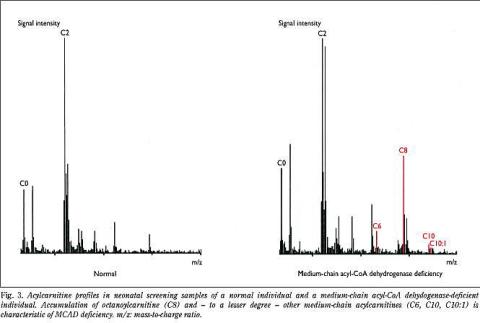 Den hyppigste af de nye metaboliske sygdomme, som kanpåvises ved MS/MS er mellemkædet acyl-CoA-dehydrogenase (MCAD)-mangel. Allelfrekvensstudier har vist, at den beregnede incidens af MCAD-mangel er særlig høj i nordeuropæiske populationer, cirka 1:10.000-1:20.000 (3, 4), og sygdommen har dermed en hyppighed af samme størrelsesorden som PKU. Enzymdefekten fører til nedsat oxidation af mellemkædede fedtsyrer, hvilket under normale omstændigheder tolereres af de afficerede. Men patienterne er i latent livsfare ved faste eller ved interkurrent sygdom, som kan føre til katabolisme og øget energiomsætning. Da betaoxidationen er delvist defekt, kan organismen ikke imødekomme energibehovet ved at øge forbrændingen af fedt, og der opstår en metabolisk krise med hypoketotisk hypoglykæmi, encefalopati og leveraffektion. Ud over hypoglykæmi spiller ophobning af toksiske biprodukter fra den defekte fedtmetabolisme muligvis også en rolle i patogenesen. Behandlingen i det akutte stadium er glukosetilførsel, mens temaet for langtidsbehandlingen er at forebygge metaboliske kriser ved at undgå faste og ved at supplere kosten med hyppige, kulhydratrige måltider, evt. glukoseinfusion ved interkurrent infektion. En opgørelse af 120 afficerede viste, at blandt MCAD-patienter, som debuterede med metabolisk krise, omkom 20 %, og 25 % fik varige neurologiske sequelae (5). Blandt de diagnosticerede kan man helt forebygge metaboliske kriser, og langtidsprognosen er derfor god (6). Screening for sygdommen kan foretages med høj diagnostisk præcision ved måling af mellemkædede acylkarnitiner i PKU-kortene fra nyfødte (7). Fig. 3 viser acylkarnitinprofilerne i PKU-kort fra en rask nyfødt og fra en patient med MCAD-mangel.