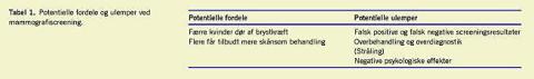 I denne statusartikel beskrives potentielle fordele og ulemper ved mammografiscreening for brystkræft med særlig fokus på resultater for programmerne i København og på Fyn.